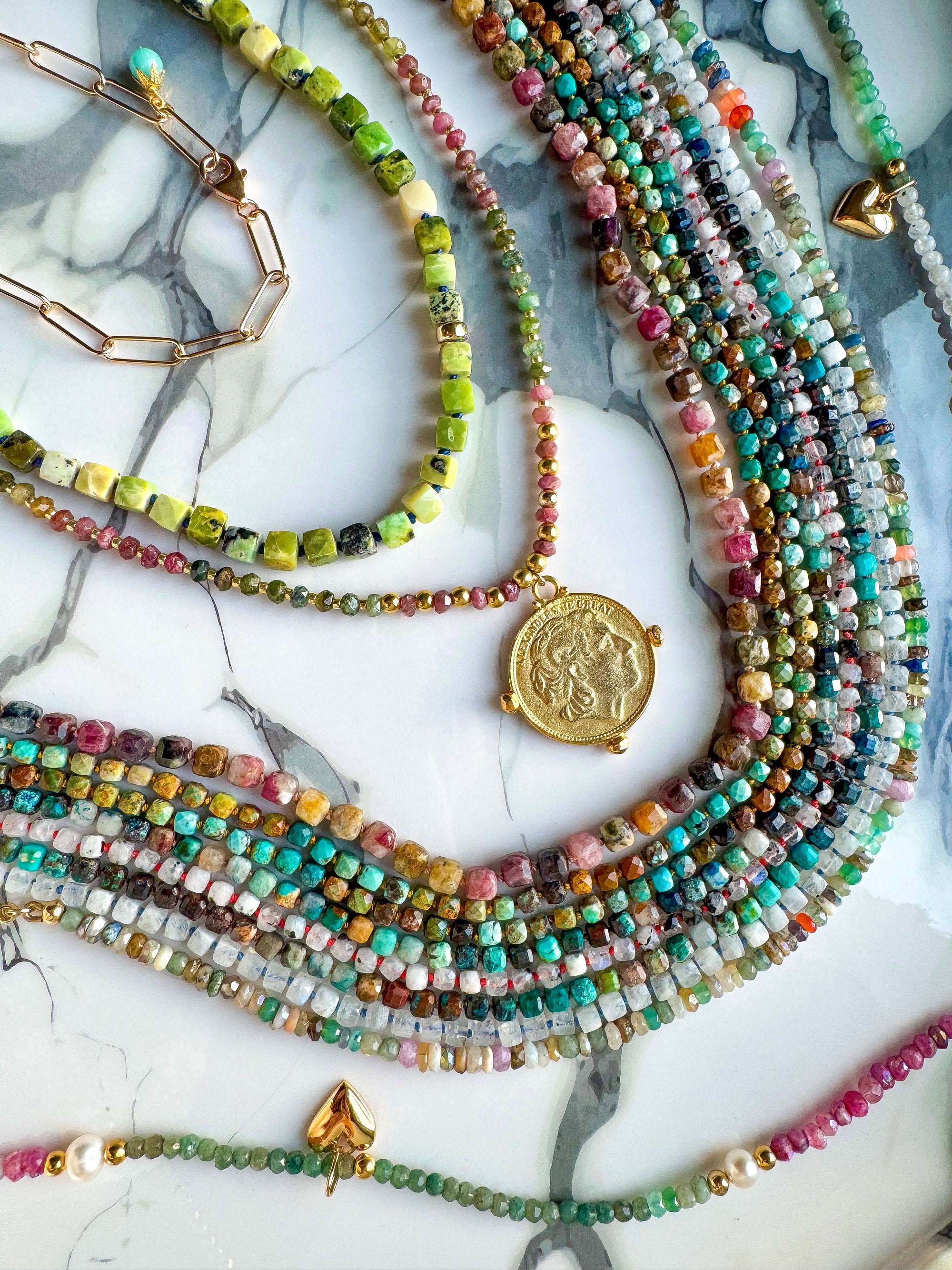 Shop Lucky Charms specializes in artisan-made beaded necklaces and charm jewelry featuring natural gemstones. Each piece is individually hand-knotted on silk cord with gold-filled findings and closures designed to last for years of daily wear. We also offer some gold plated pieces for a variety in our price range.
