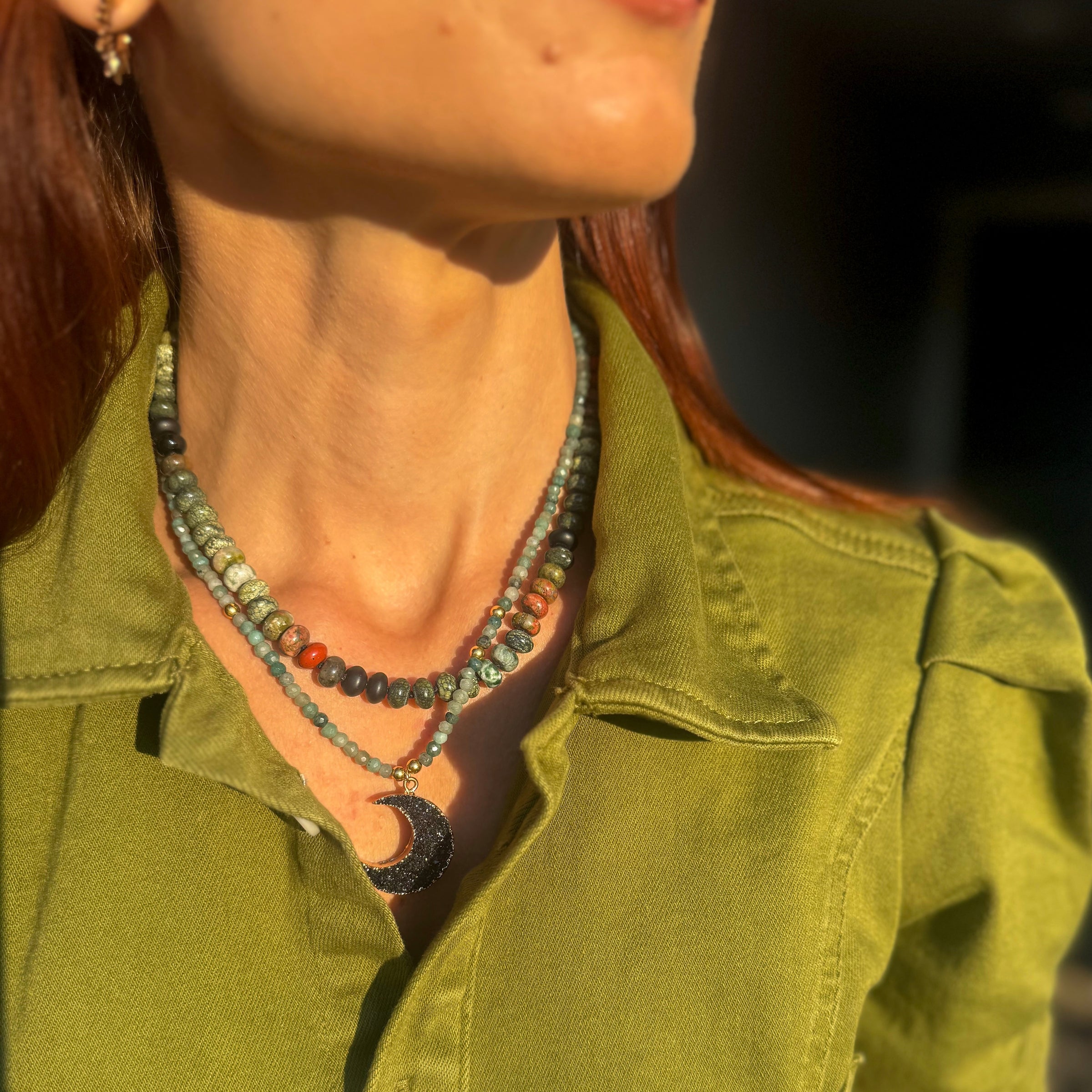 Discover the perfect blend of earthy elegance and artisan craftsmanship with our Earth & Ember Necklace. This stunning handcrafted piece features a carefully curated collection of natural gemstones in rich, organic tones that evoke moss-covered trails, autumn leaves, and flickering firelight.