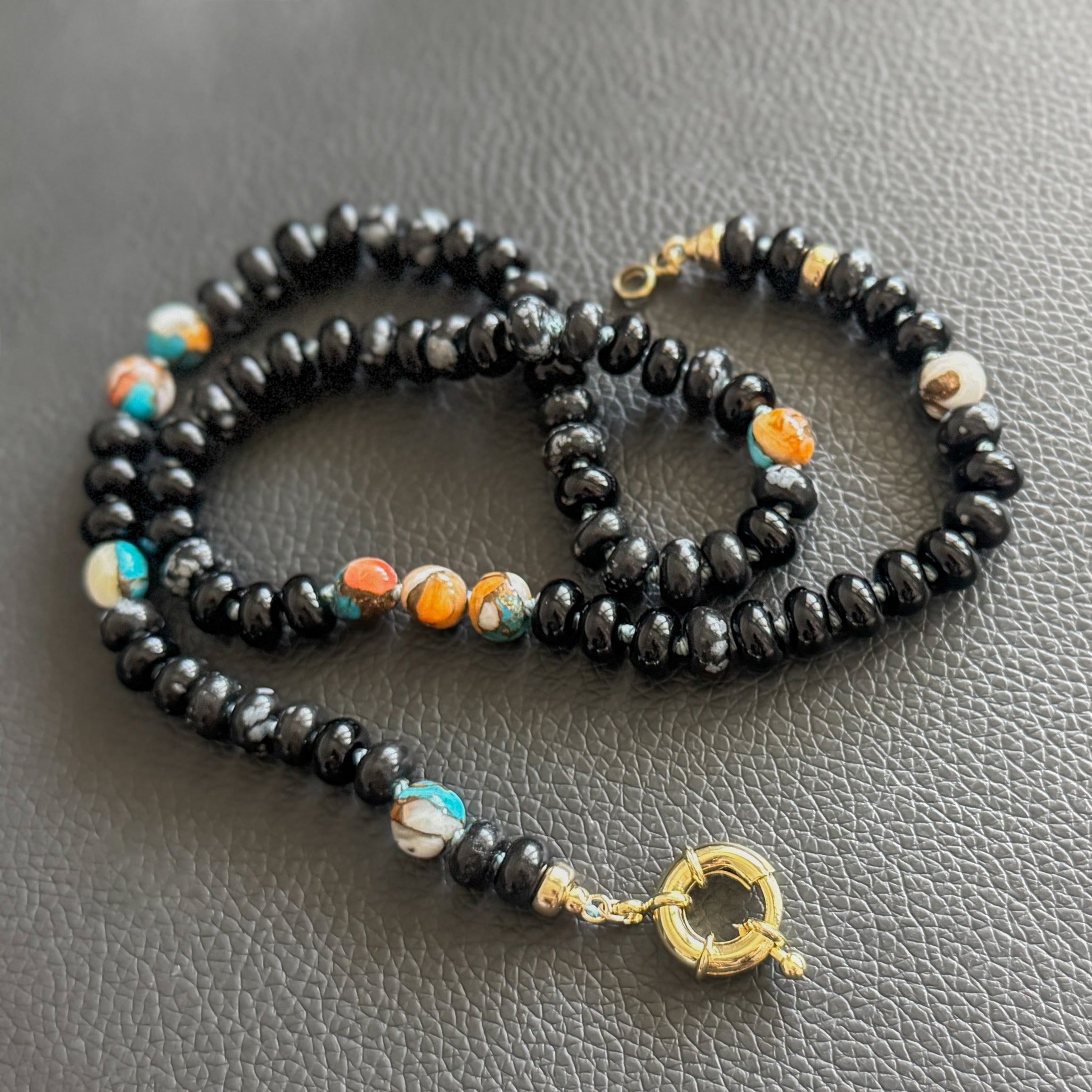 ∙ Genuine gemstones: black onyx, snowflake obsidian, Kingman turquoise, spiny oyster shell