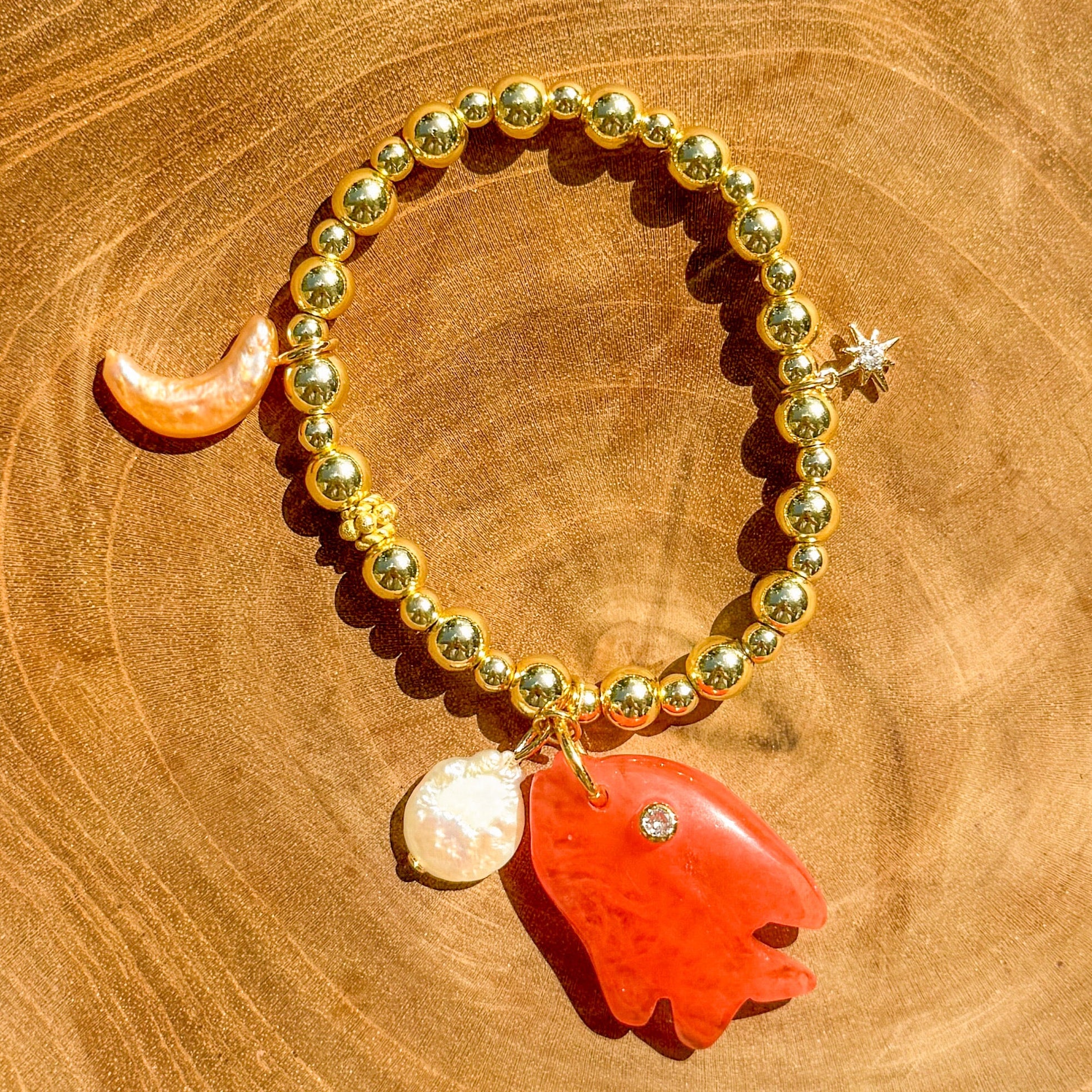 The Moonfish — A carved watermelon quartz fish charm, baroque pearl, moon-shaped pearl, and starburst charm. Dreamy, oceanic, and a little magical.